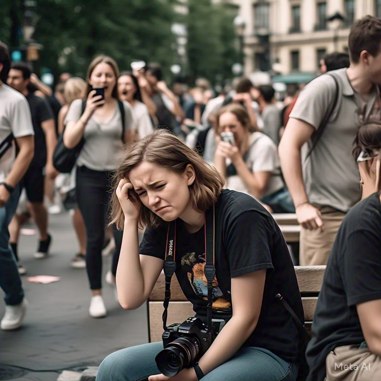 P.S.: Image made on Meta AI using the prompt, “Imagine a sad content creator who's being trolled by the crowd in a public place”