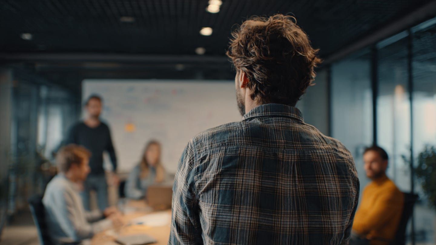P.S.: Image made on Meta AI using the prompt, “Create an image of a realistic 16:9 image of a founder standing slightly back while a small team collaborates around a whiteboard. Calm leadership posture. Modern workspace. No text or logos. Cinematic lighting, modern environment”