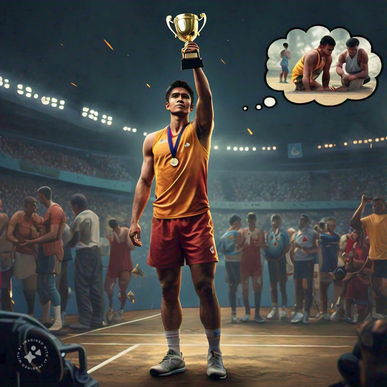 P.S.: Image made on Meta AI using the prompt, “Imagine a sportsperson with a trophy in their hand thinking about the days of the past depicted visually in a thought bubble when they were just an amateur”