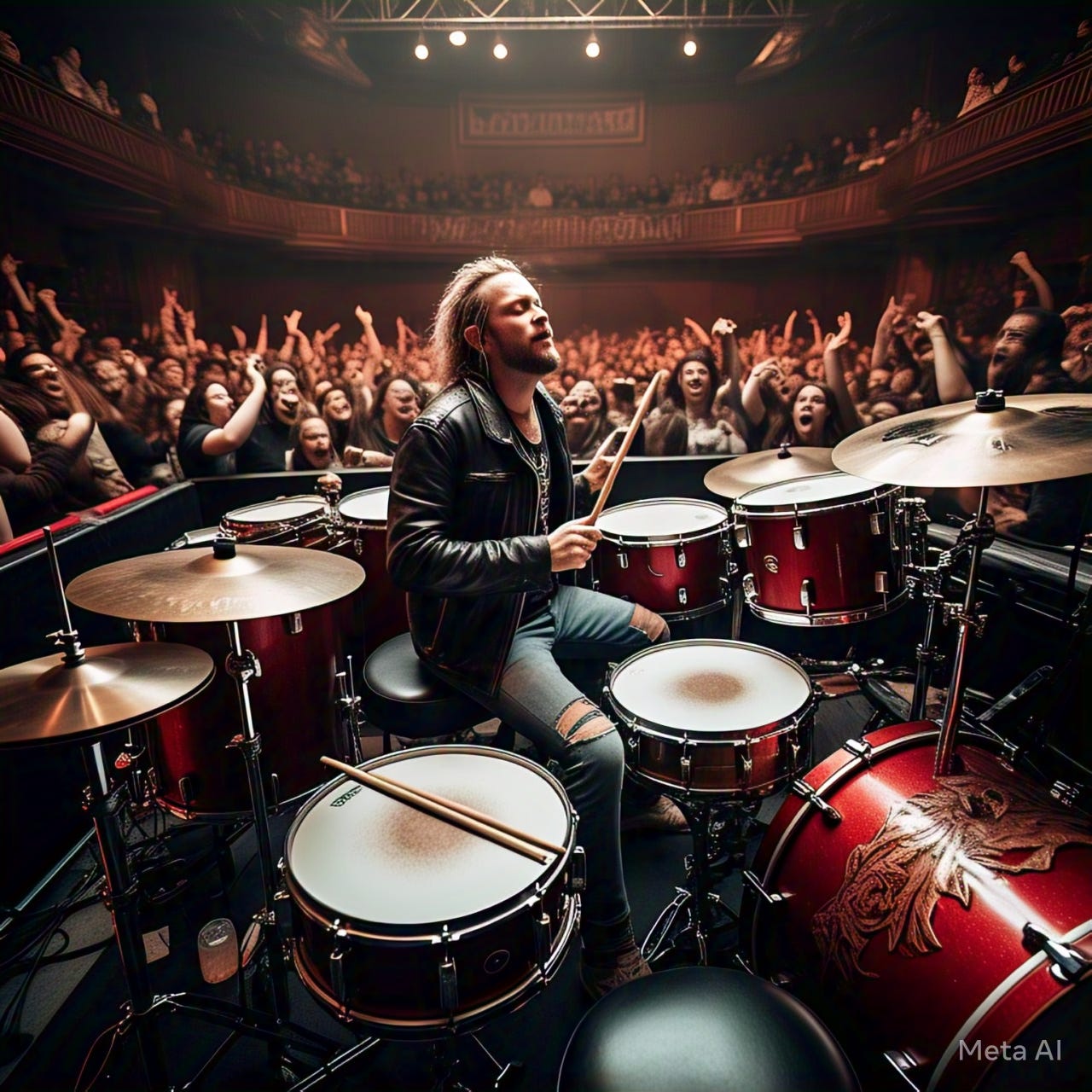 P.S.: Image made on Meta AI using the prompt, “Imagine a drummer performing in front of a large crowd but the eyes of the drummer are shut because they're in a trance as they play for the crowd”