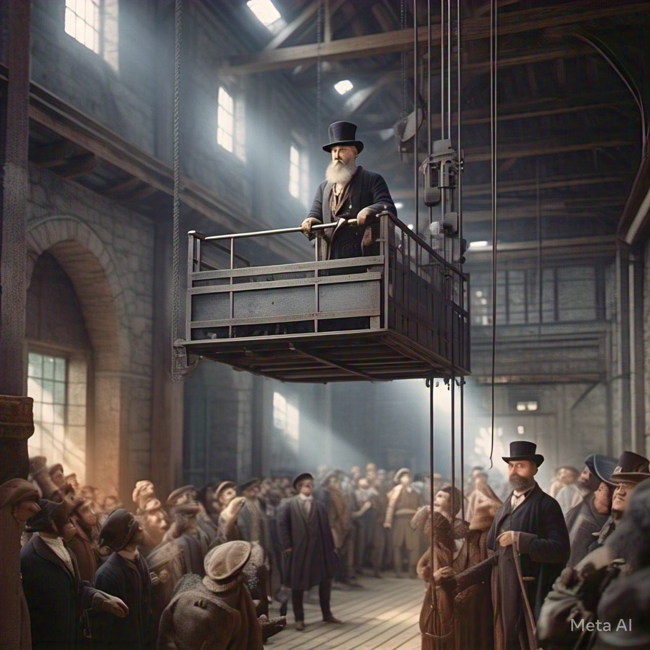 P.S.: Image made on Meta AI using the prompt, “Re-imagine Elisha Otis’ demonstration of an elevator from 1854”