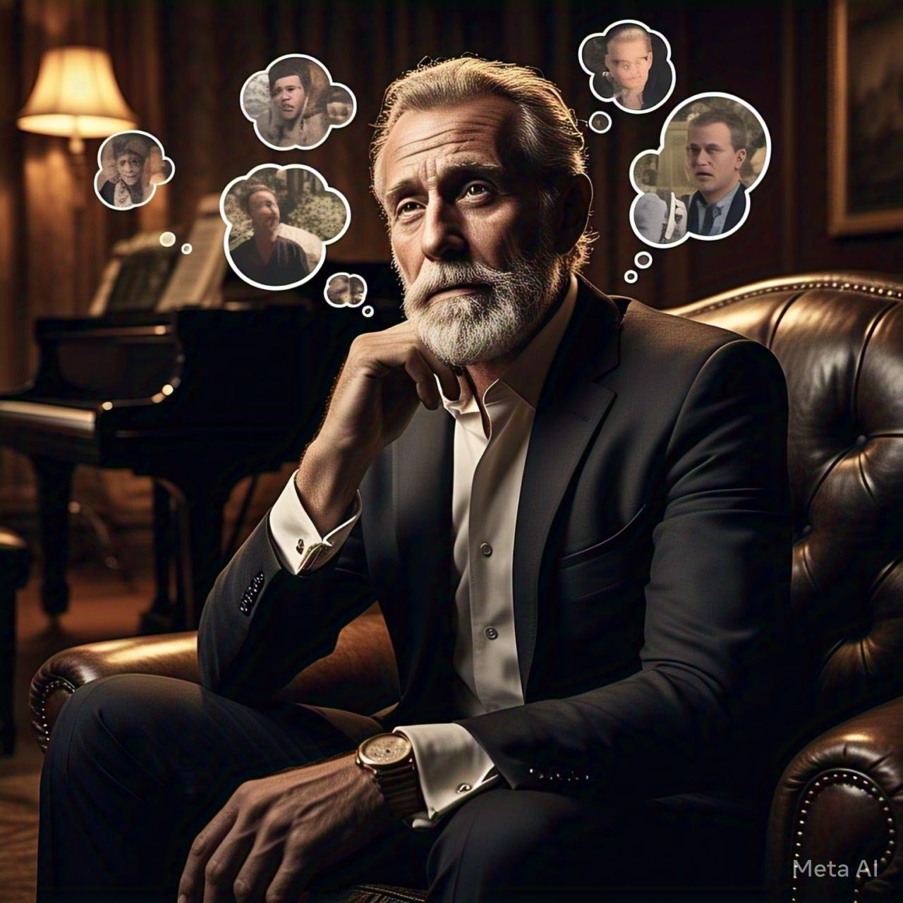 P.S.: Image made on Meta AI using the prompt, “Imagine someone who's really rich thinking about the old days when they worked really hard to achieve everything they have achieved. Show thoughts about past in thought bubbles”