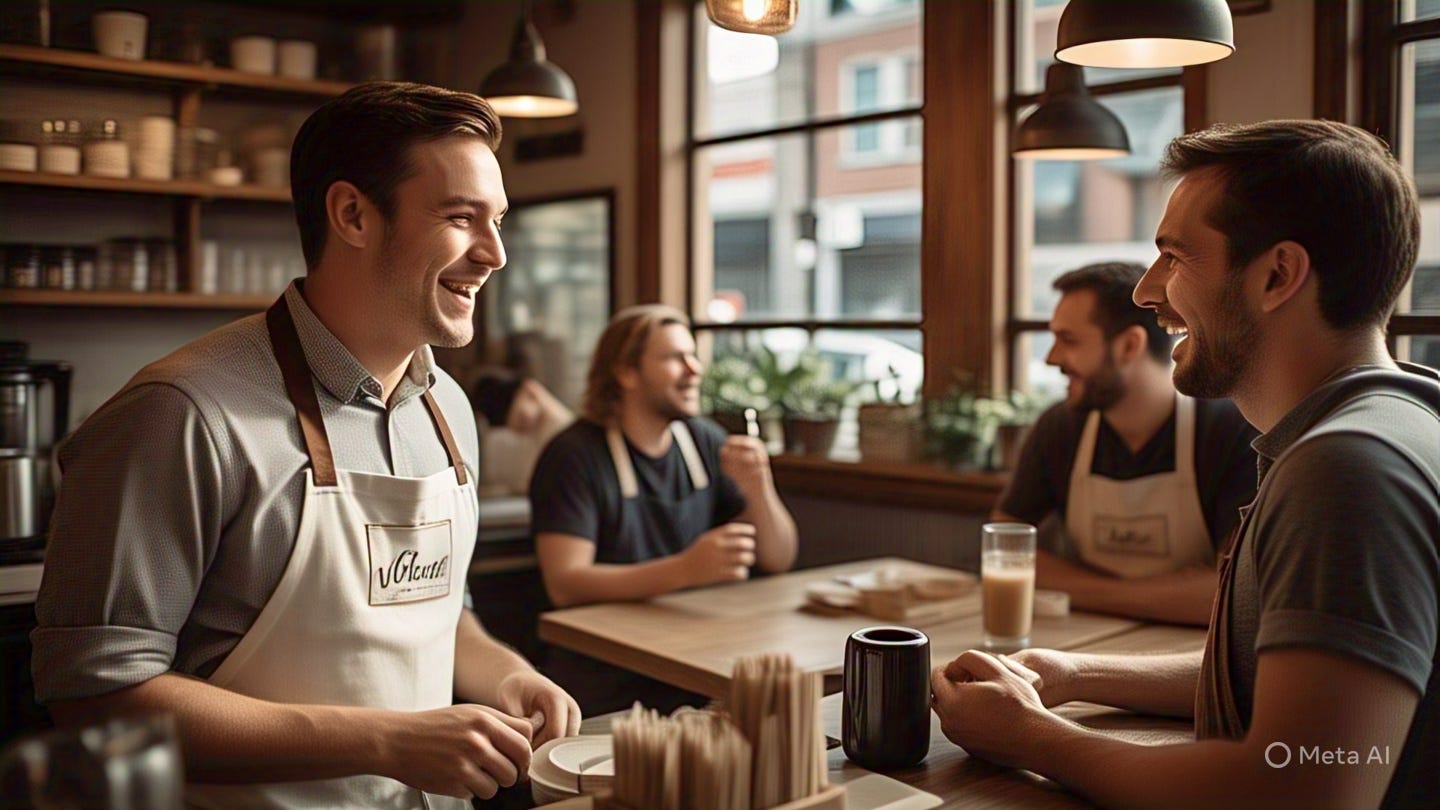 P.S.: Image made on Meta AI using the prompt, “Imagine a cafe owner with a wide smile on their face interacting with the customers who are happy with their experience”