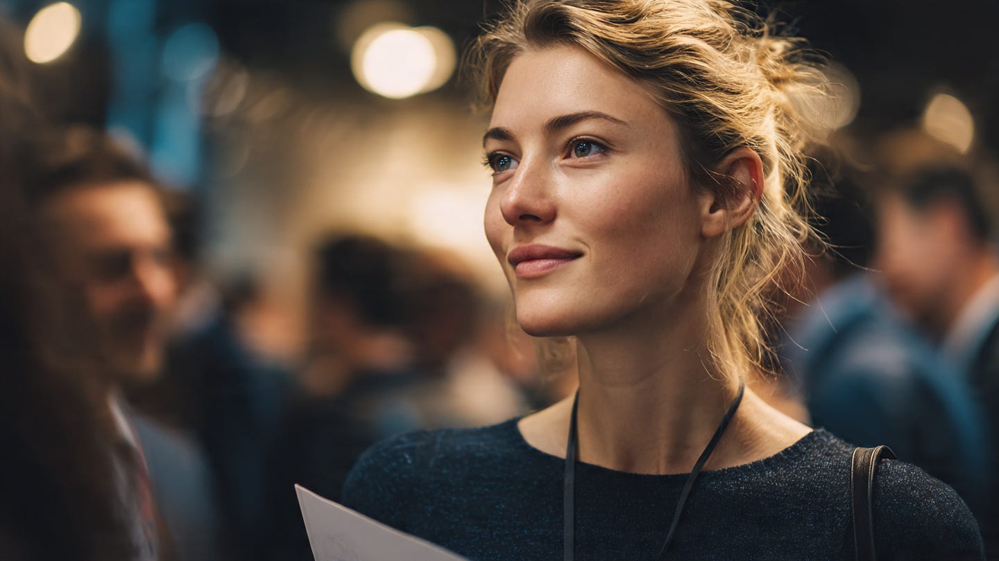 P.S.: Image made on Meta AI using the prompt, “Create an image of a realistic 16:9 image of a young professional standing confidently in a crowded networking event, not holding documents, calmly engaged in conversation. Warm lighting. Focused expression. No text or logos.”