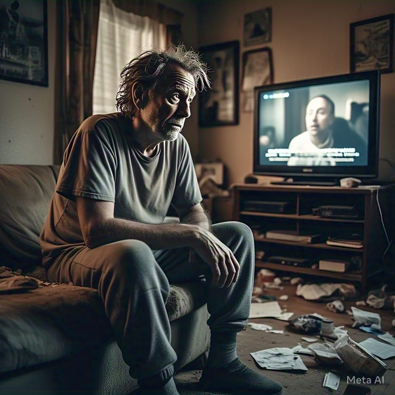 P.S.: Image made on Meta AI using the prompt, “Imagine a loser who's lost their job for a few months and the only thing they do now is sit on the couch, watch tv and sulk”