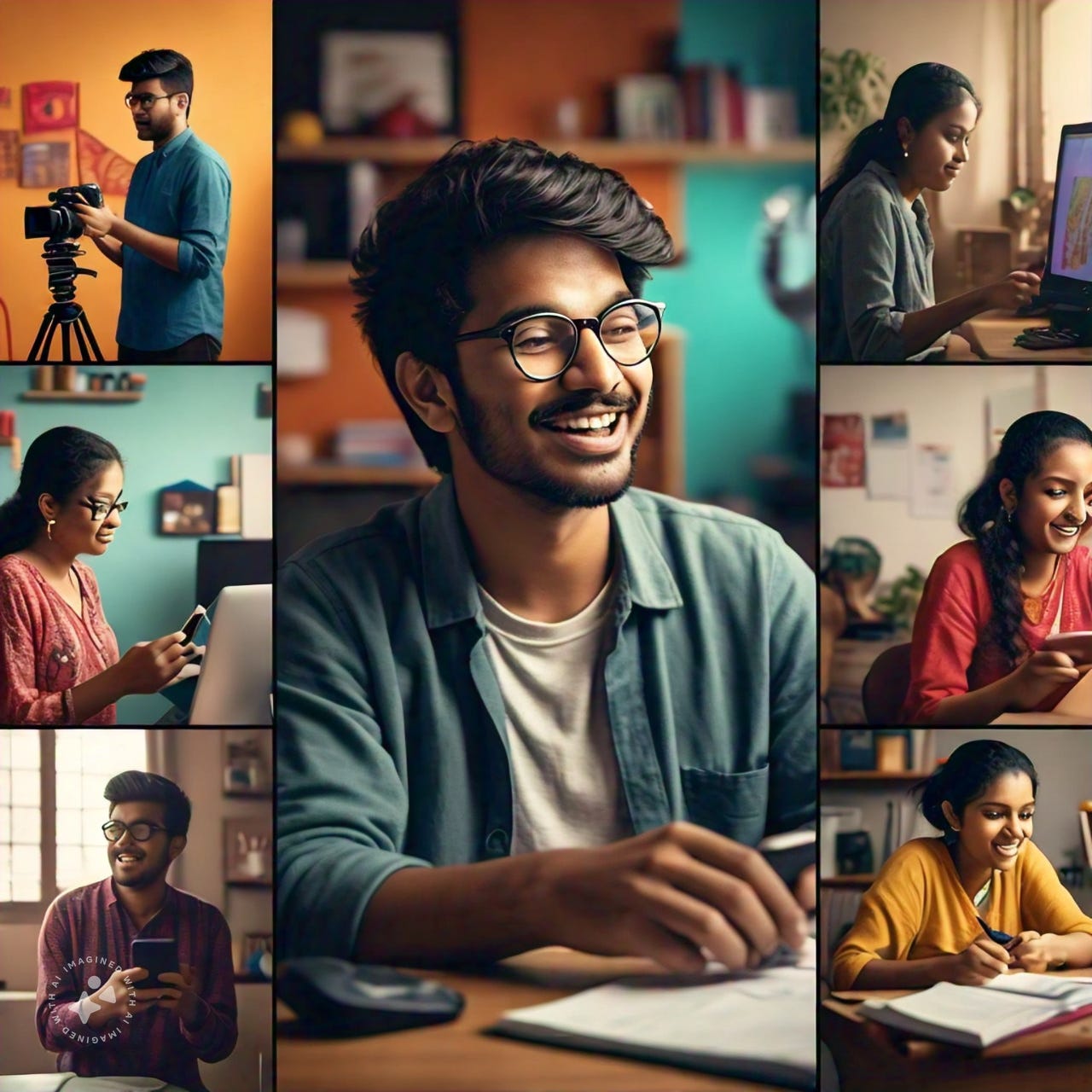 Image created using Meta AI. The prompt used to create the image is, "Imagine an Indian content creator in a grid of 4 squares wherein they're shooting content in one square, replying to comments in the second square, learning new skills in the third square and meeting their community members in the fourth square"