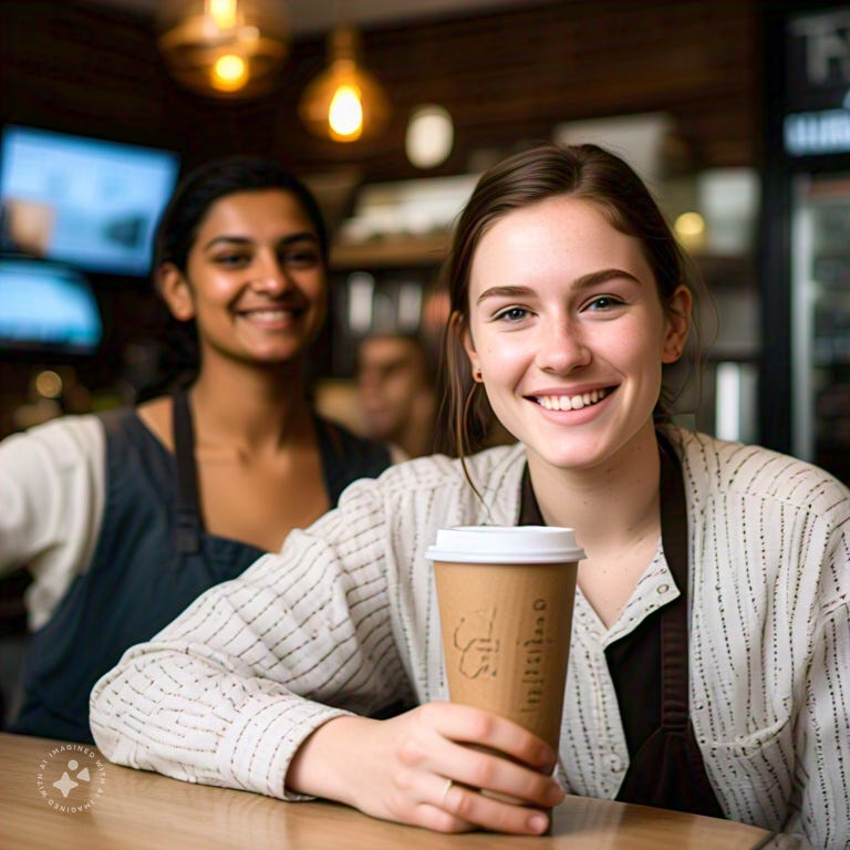 P.S.: Image made on Meta AI using the prompt, “Imagine a customer at a cafe smiling with a paper cup of coffee in their hand and the barista in the background smiling and waving at them”