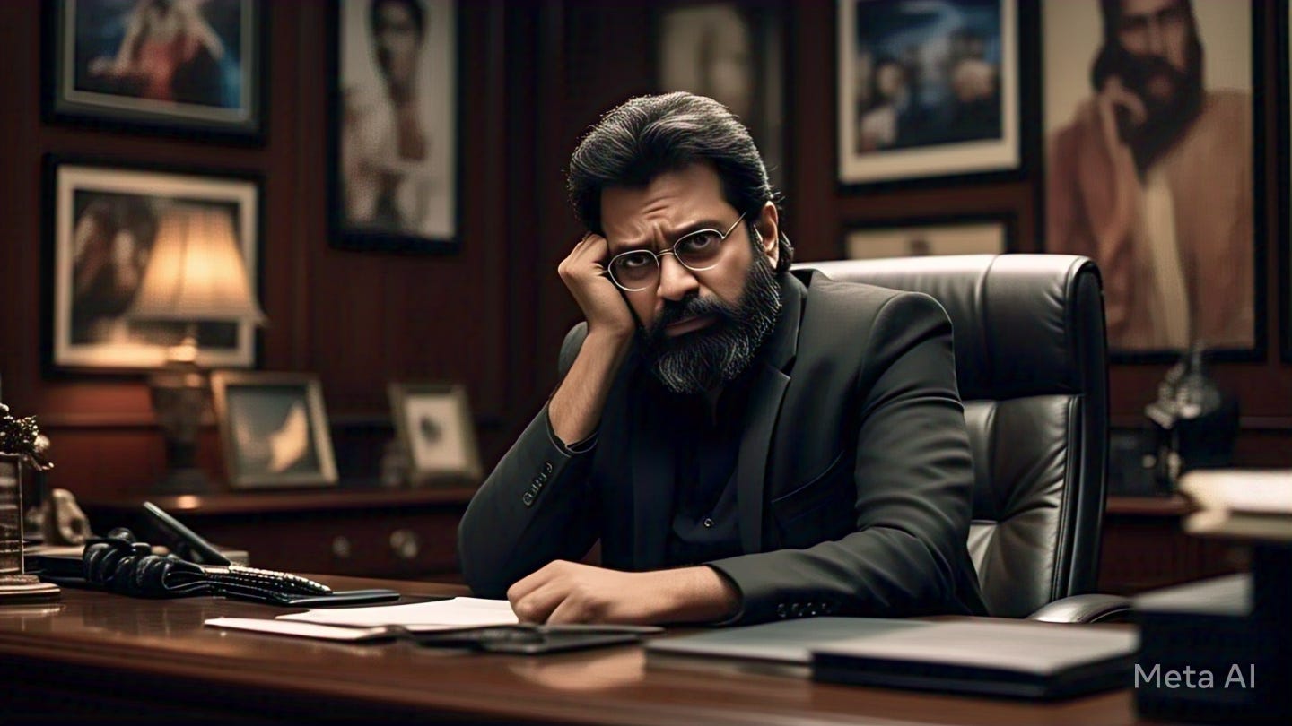 P.S.: Image made on Meta AI using the prompt, “Imagine a Hindi movie producer lamenting over the latest movie from their studio being declared as a flop by media”