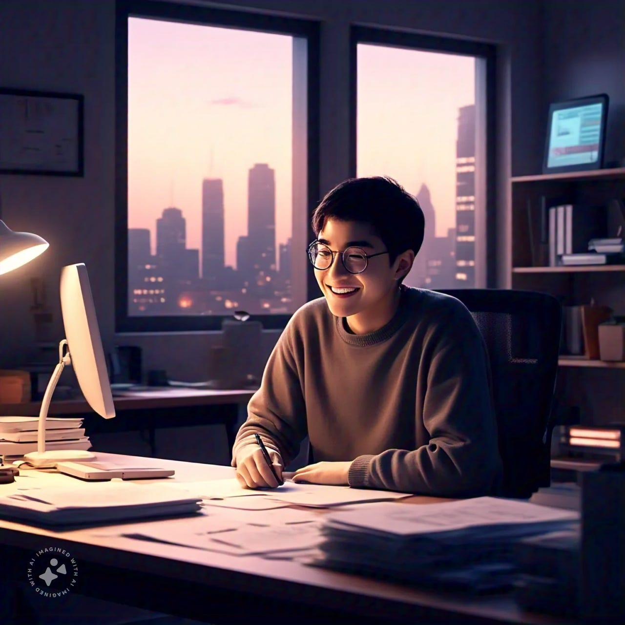 P.S.: Image made on Meta AI using the prompt, “Imagine someone working alone in the office in the middle of the night but there is a happy smile on their face because they love what they do.”
