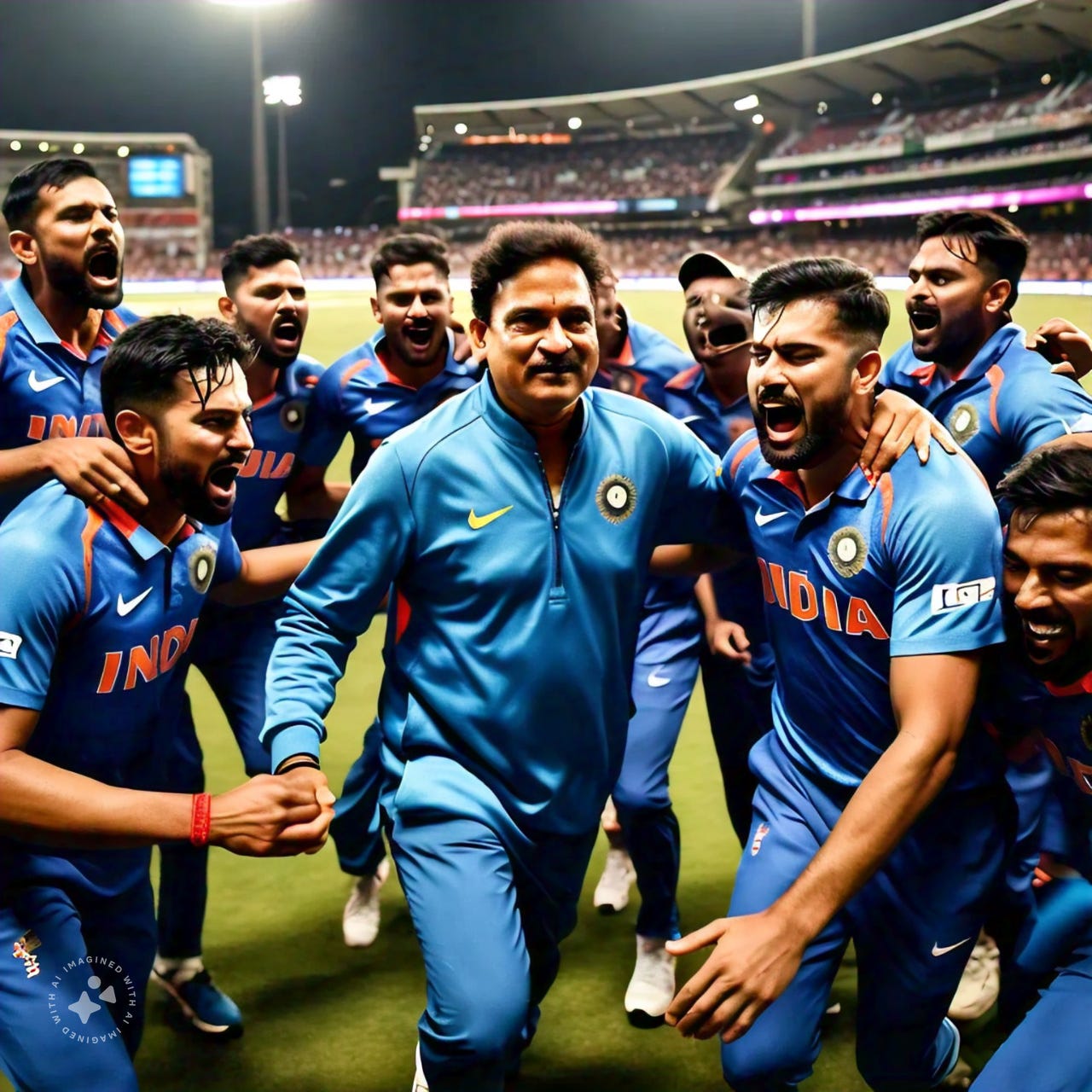 P.S.: Image made on Meta AI using the prompt, “imagine a stadium where the Indian cricket team is playing and winning, and we see the proud coach in the frame”