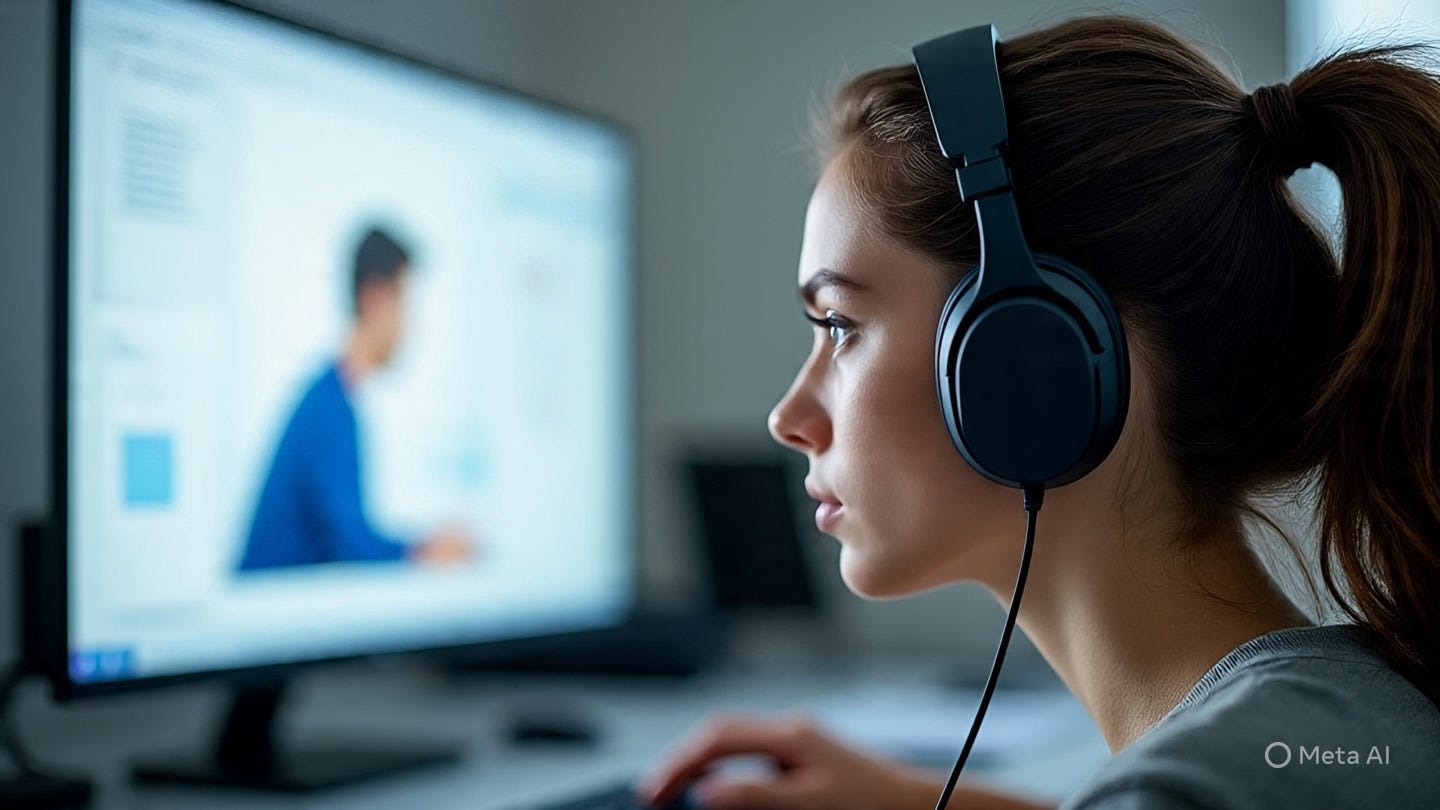 P.S.: Image made on Meta AI using the prompt, “Imagine someone working in front of a large monitor screen with headphones on and they're concentrating on the screen to the extent that their zen mode is visible on their face”