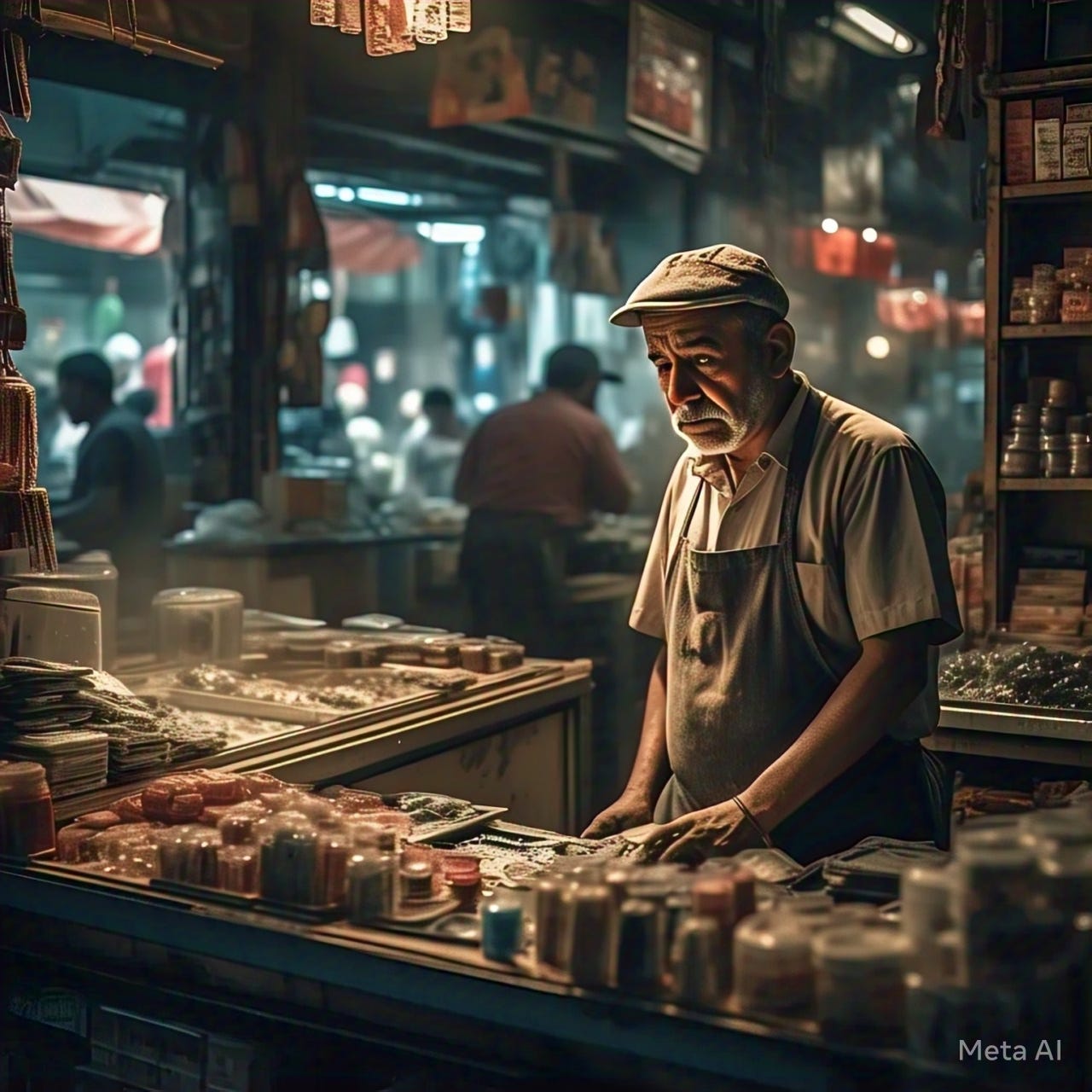 P.S.: Image made on Meta AI using the prompt, “Imagine a sad (almost in tears) shopkeeper in a busy market with zero customers in their store”