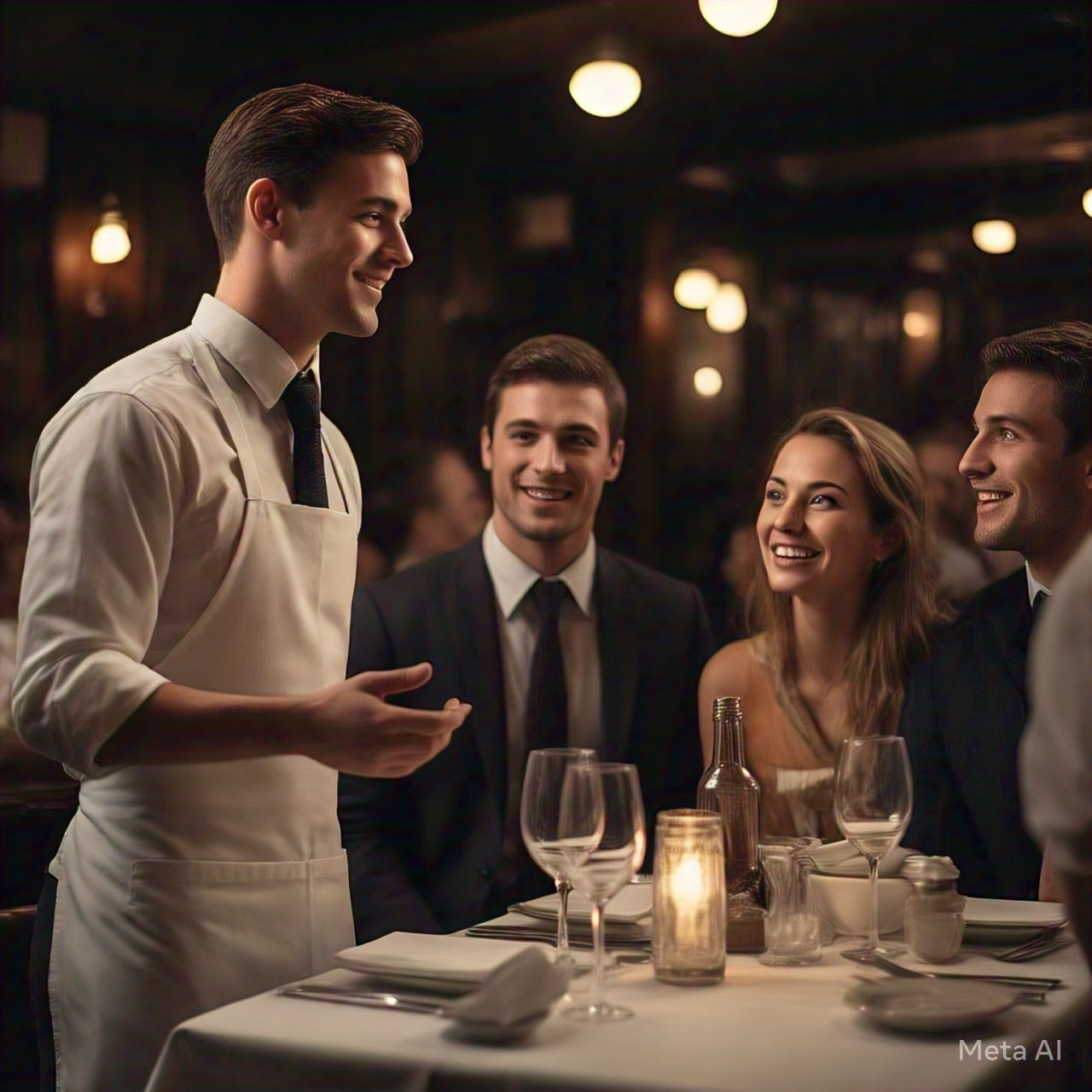 P.S.: Image made on Meta AI using the prompt, “Imagine a waiter being polite, smiling and talking to a table of new customers”
