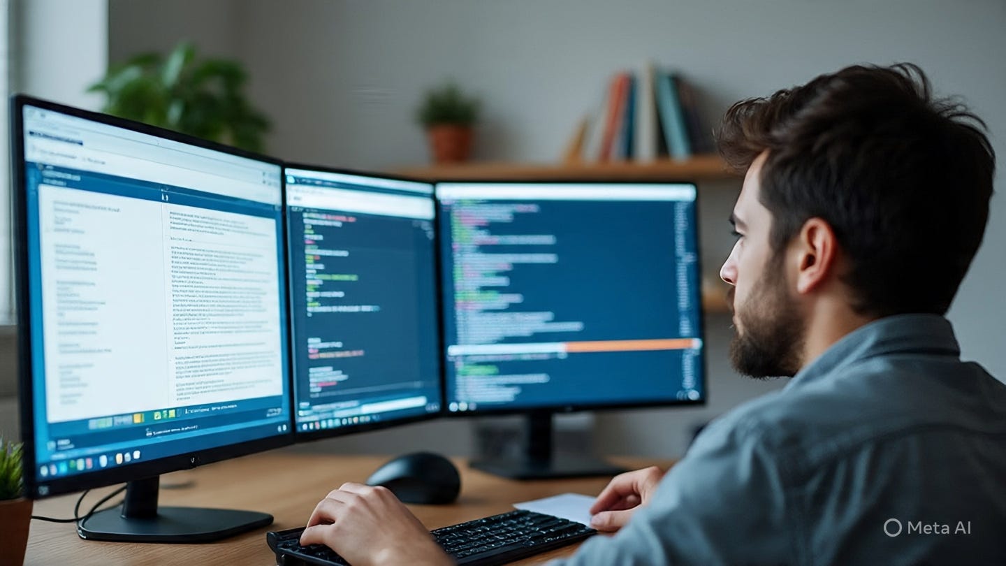 P.S.: Image made on Meta AI using the prompt, “Create an image of someone in their thirties in front of multiple screen computers doing research and learning by reading some articles, watching podcasts, etc.”