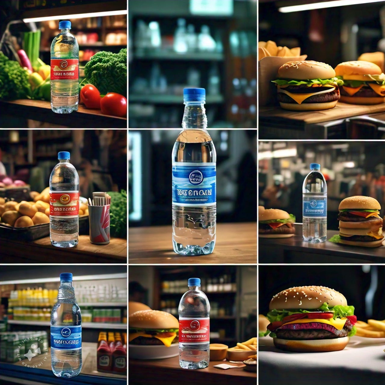 P.S.: Image made on Meta AI using the prompt, “Imagine a grid of 4 and show a bottle of water in a local market, in a burger joint, in a supermarket and in a fine dining restaurant”