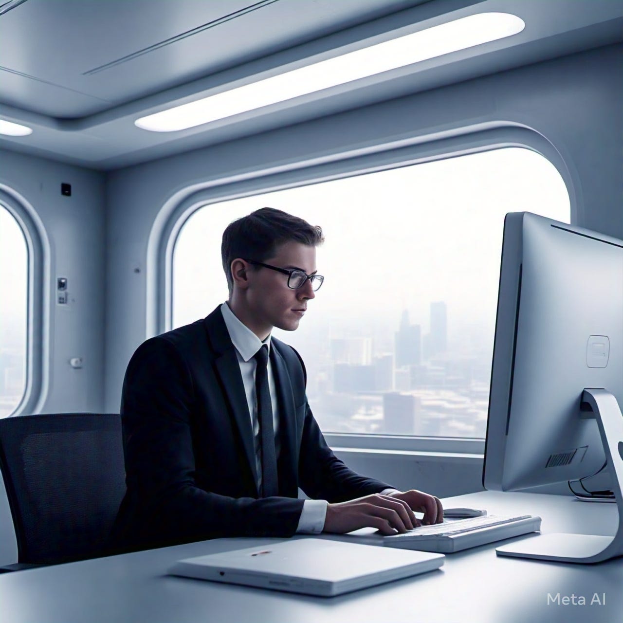 P.S.: Image made on Meta AI using the prompt, “Imagine a smart working professional in their 20s working in front of a high end computer in 2035”