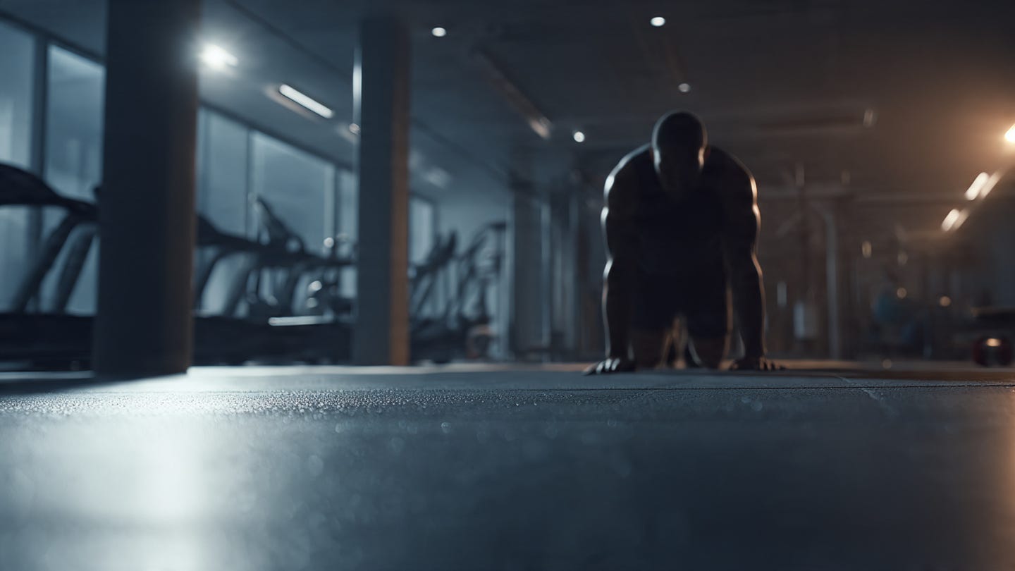P.S.: Image made on Meta AI using the prompt, “Create an image of a realistic 16:9 image of a lone athlete or professional training in close up early in the morning in an empty, but well equipped gym. Low light. Calm focus. No audience. No text or logos.”