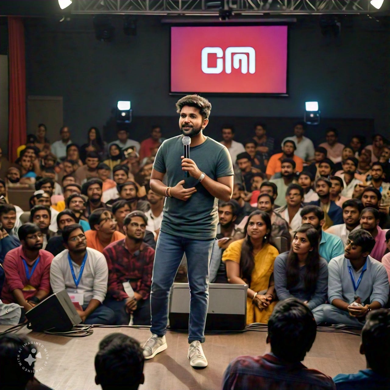 P.S.: Image made on Meta AI using the prompt, “Imagine an Indian content creator in their 20s giving a speech to a full auditorium about how to build a personal brand through content creation”