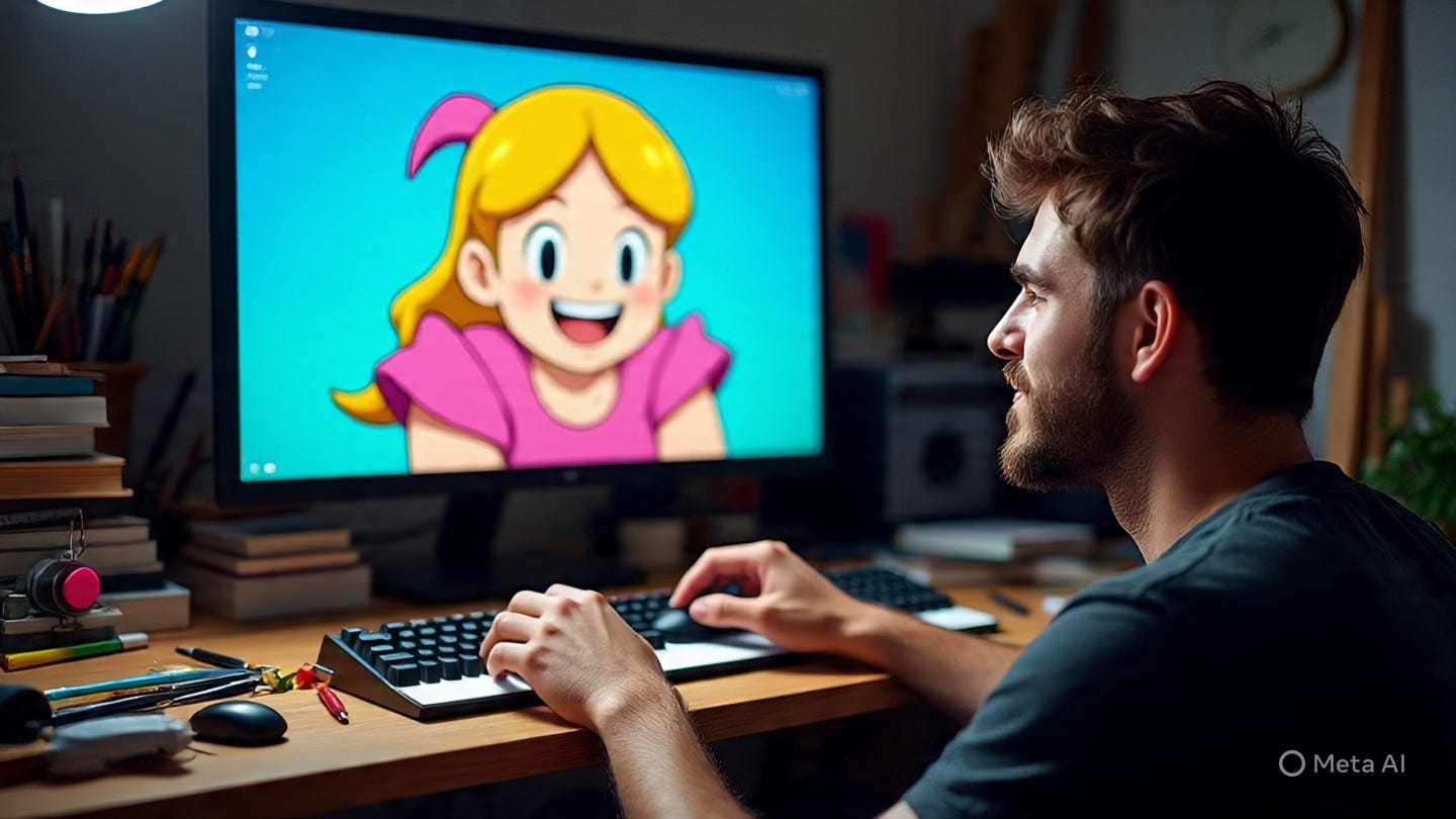 P.S.: Image made on Meta AI using the prompt, “Create an image of an artist working in front of a large monitor/ canvas creating a character with a large smile on their face because they can envision the humungous scope of growth that owning the intellectual property of this character brings”